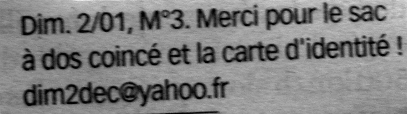 Dimanche 2/01, M°3. Merci pour le sac à dos coincé et la carte d’identité ! dim2dec@yahoo.fr