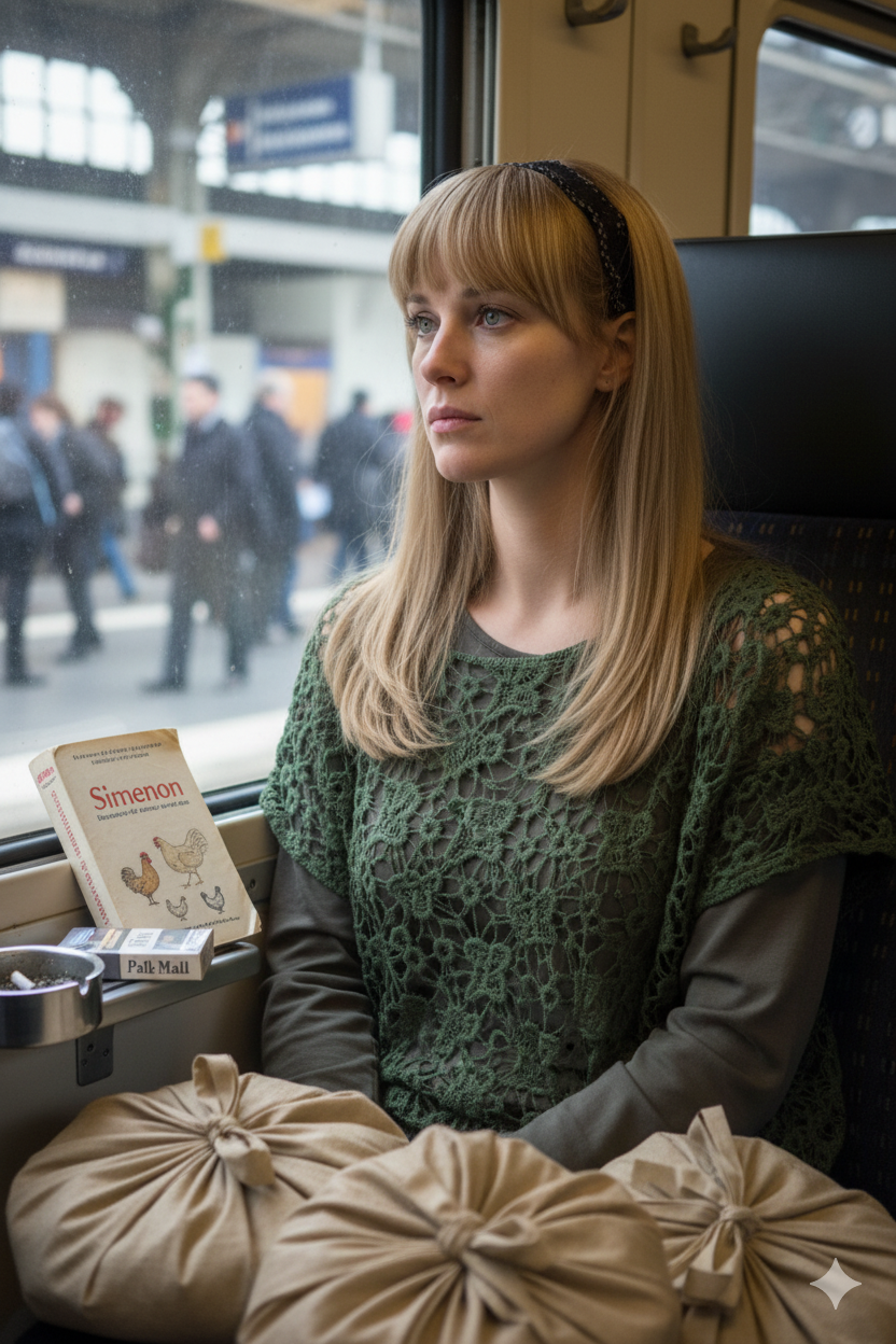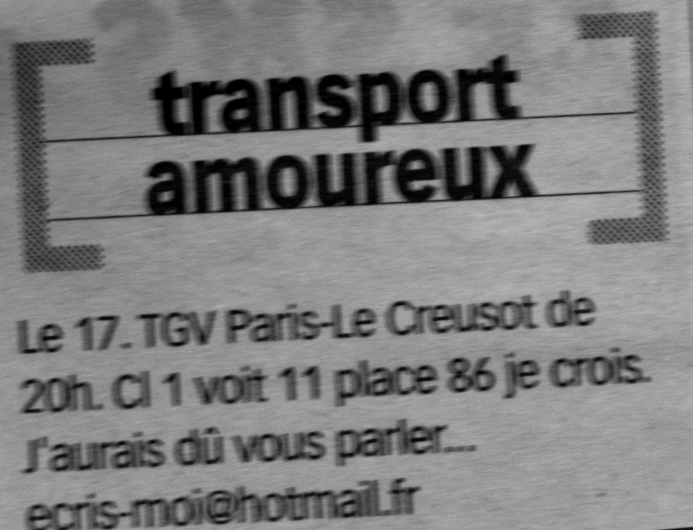 25 décembre., Paris-Austerlitz, 09h09. Vous veniez d’Alsace pour aller à Périgeux, chargée de 3 sacs pleins de cadeaux. Simenon, vos poules-coqs, no TV, du Pall-Mall fumé en bout de wagon. J’aimerai beaucoup, beaucoup, beaucoup vous reparler. Pierre. 06 11 86 34 51