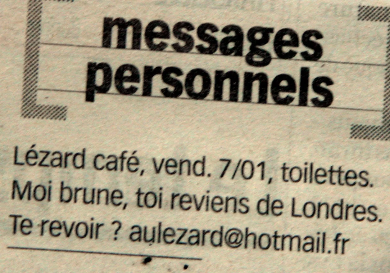 Lezard café, vendredi 7/01, toilettes. Moi brune, toi reviens de Londres. Te revoir ? aulezard@hotmail.fr