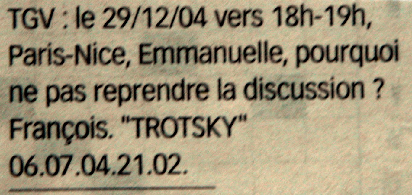 TGV : le 29/12/04 vers18h-19h, Paris-Nice, Emmanuelle, pourquoi ne pas reprendre la discussion ? François. « TROTSKY » 06 07 04 21 02