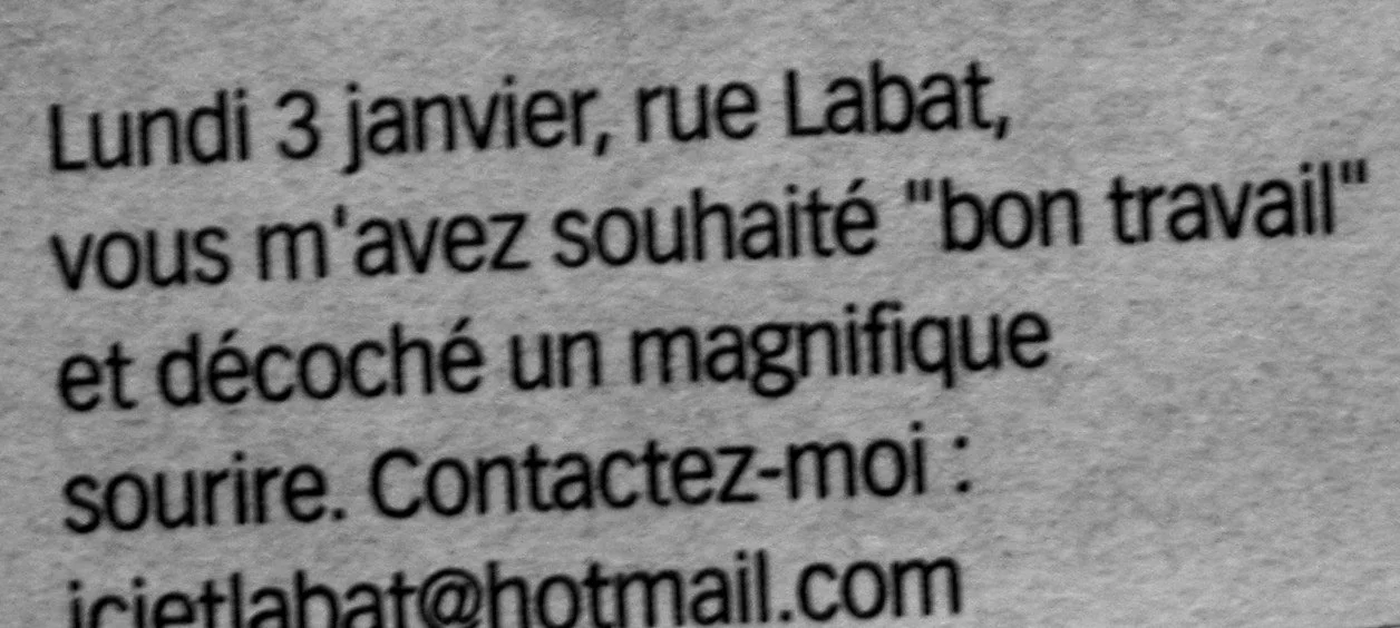 Lundi 3 janvier, rue Labat, vous m’avez souhaité « bon travail » et décroché un magnifique sourire. Contactez-moi : icietlabat@hotmail.com