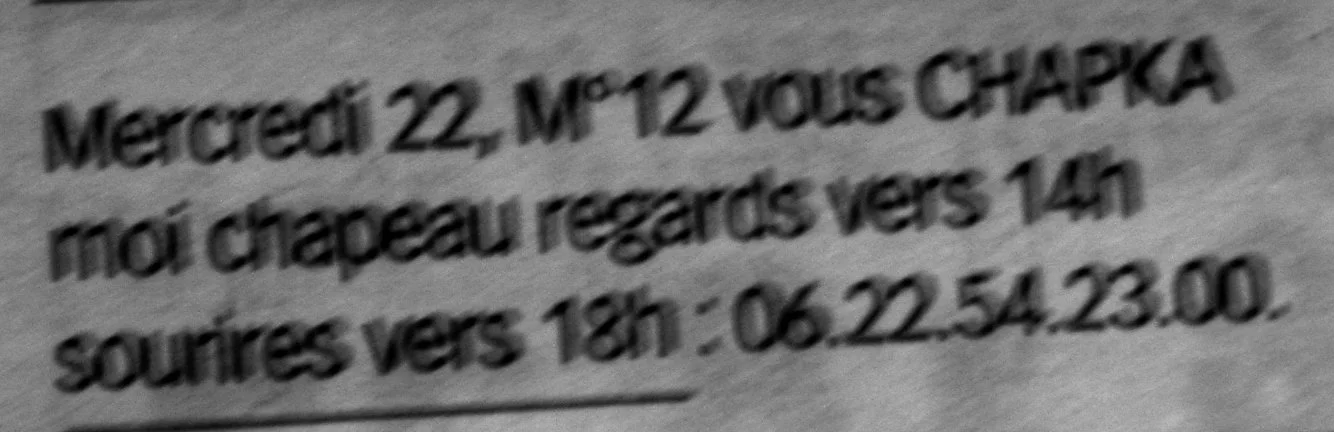 La petite annonce réelle : Chaque photographie est accompagnée d'une petite annonce authentique, tirée des colonnes du journal Libération. Ces textes bruts, souvent terre à terre, parfois poétiques, ou empreints de nostalgie, voire d'humour décalé, sont le point de départ de notre exploration visuelle. Ils sont les témoignages de vies qui se cherchent, de désirs qui s'expriment, de cœurs qui espèrent.